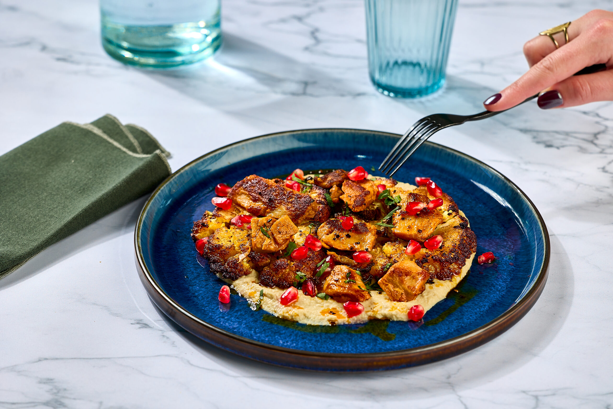 • Chou-fleur rôtis, houmous, ail confit et émincés Tex Mex