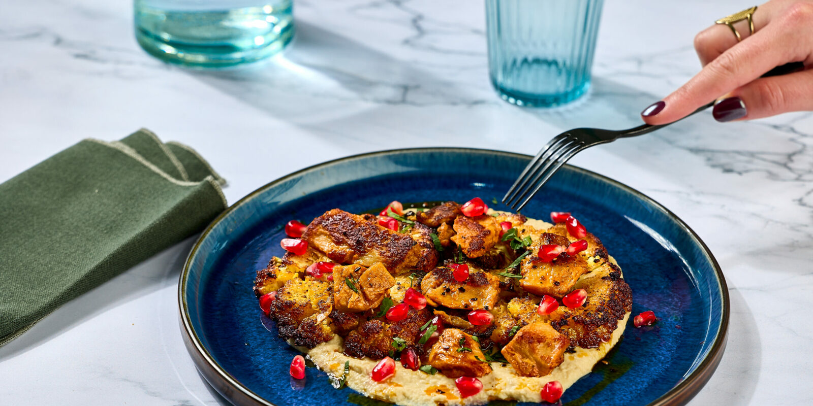 Disposer les émincés Tex-mex Accro sur le chou-fleur. Napper l'ensemble avec 2 cuillères à soupe d'huile pimentée (en prenant soin de récupérer un peu de d'épices pour le visuel et le goût). Parsemer de graines de grenade et de pluches de persil plat fraîchement ciselées.